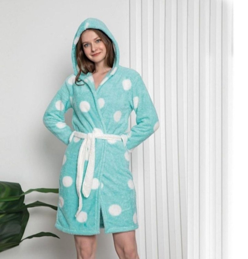 Uzun, bol kesim kadın bornoz; yumuşak kumaştan, pastel turkuaz renkte ve beyaz puantiyeli. Kapüşonlu, uzun kollu ve belden bağlamalıdır. Rahat kullanım için idealdir.