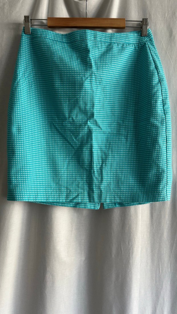 Turkuaz renkli, küçük kare puantiyeli detaylara sahip mini boy, vücuda oturan etek. Trendy günlük, kombinlere uygundur. Astarlıdır. Arkasında kısa bir yirtmaci var. Son fotoğrafta ürünün ölçüleri mevcuttur.