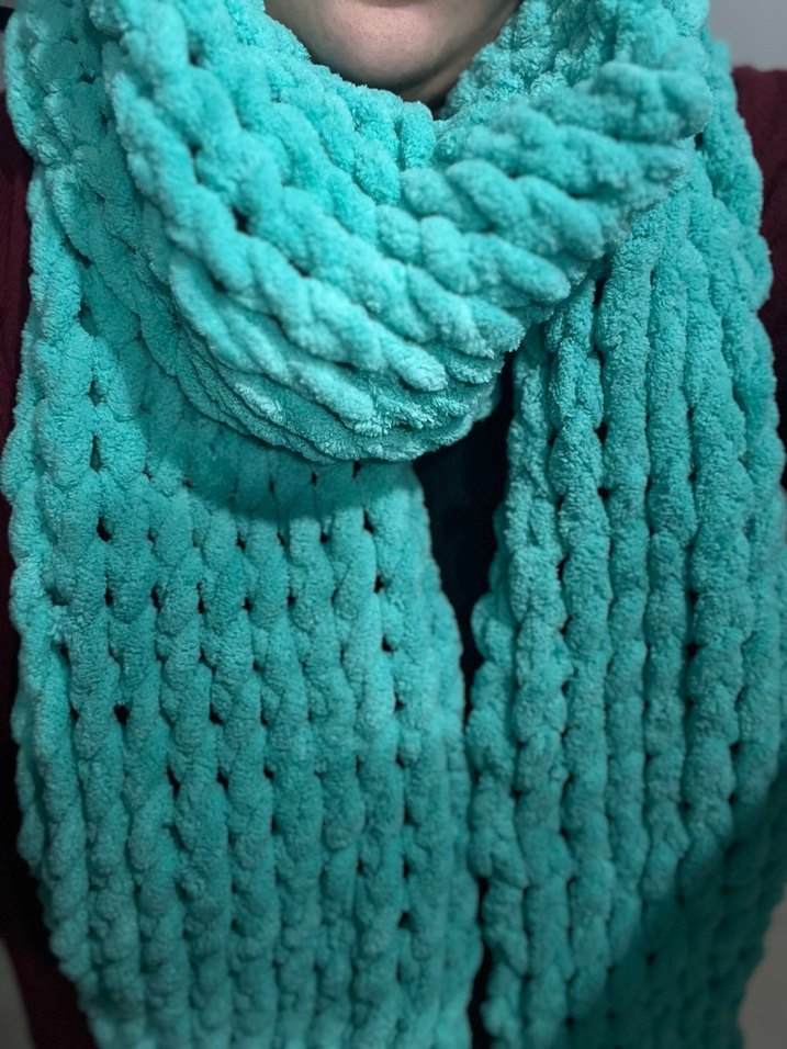 Renkli turkuaz örgü kadın atkı, yumuşak ve rahat dokusuyla dikkat çekiyor. Puffy ip ile örülmüştür