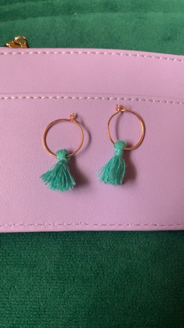 Turkuaz renkli, işlemeli detaylı püsküllü halka küpeler. Bohem tarza sahip, midi uzunlukta, günlük kullanıma uygun.