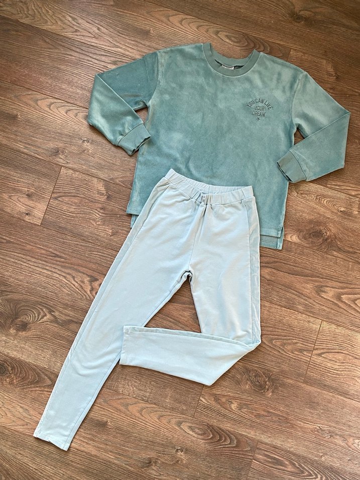 Turkuaz Rahat Kesim Kız Çocuk Kadife Şeritli Tayt ve Üst Kombin