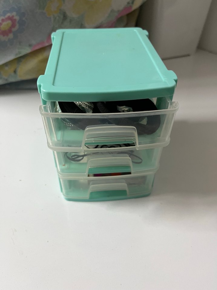 Pastel turkuaz renkli, üç çekmeceden oluşan organizer, küçük eşyaları düzenlemek için uygundur. ️