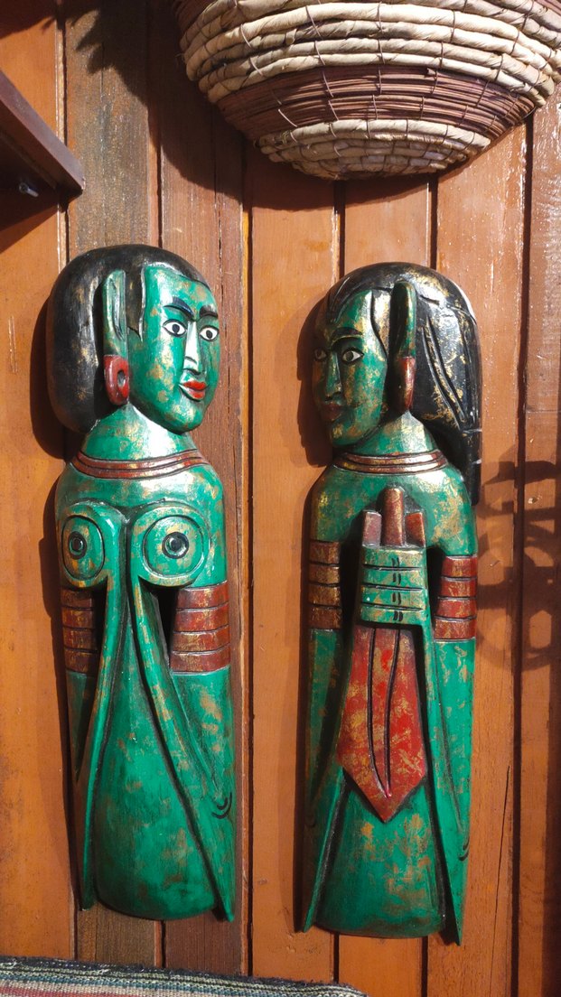 Koyu turkuaz renkte, kırmızı detaylı iki ahşap figürin. Yüz hatları ve geleneksel kıyafetlerle oyulmuş ve boyanmıştır.