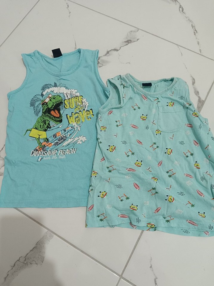Turkuaz renkli, baskılı iki çocuk atlet. Birinde 'Surf Waves, Dinosaur Beach' yazılı dinozor ve sörf teması, diğerinde küçük cep ve çeşitli eğlenceli desenler bulunur. Makul ürün