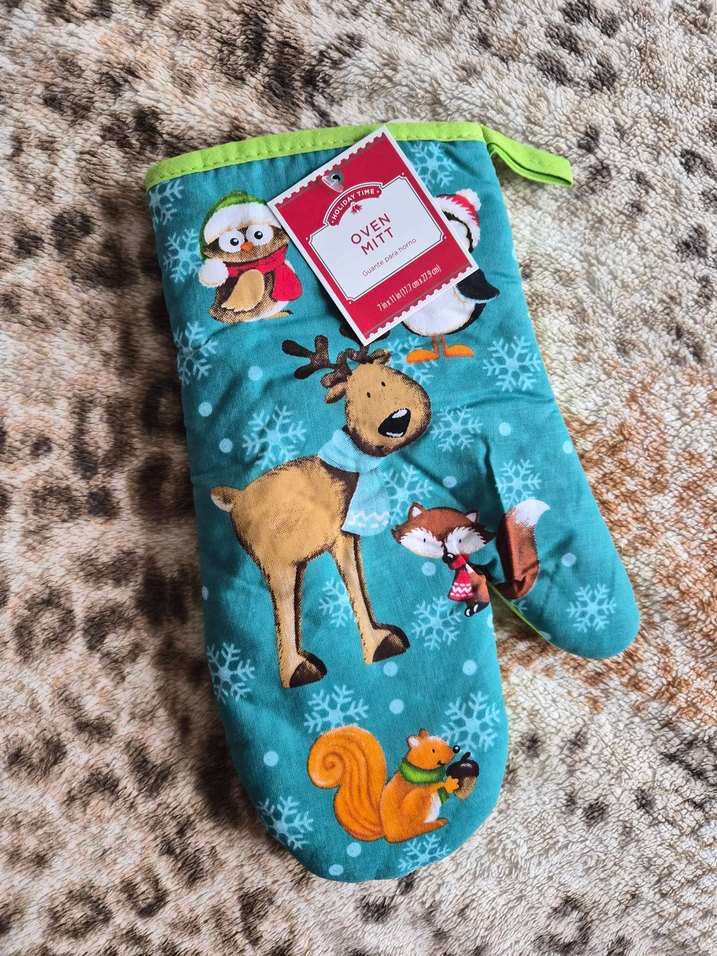 Turkuaz renkte, orman hayvanları ve kar taneleri desenli renkli baskılı fırın eldiveni. "OYEN" markası görünür. Sıcak eşyalarla çalışmak için uygun. Amerikadan alındı çok kaliteli