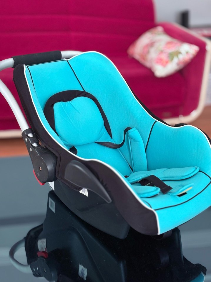 Turkuaz renkli bebek oto koltuğu, rahat yastıklı tasarımı ve güvenli emniyet kemeri ile güvenli yolculuk sağlar. Hiç bir deformesi yoktur çok az kullanıldı