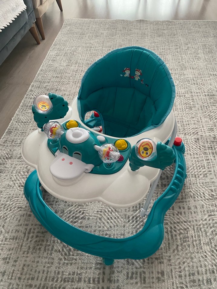 Renkli oyuncaklar ve rahat dolgulu oturma alanı olan turkuaz bebek yürüteci. Bebeklerin desteklenmesi ve oyun zamanı için tasarlanmıştır.