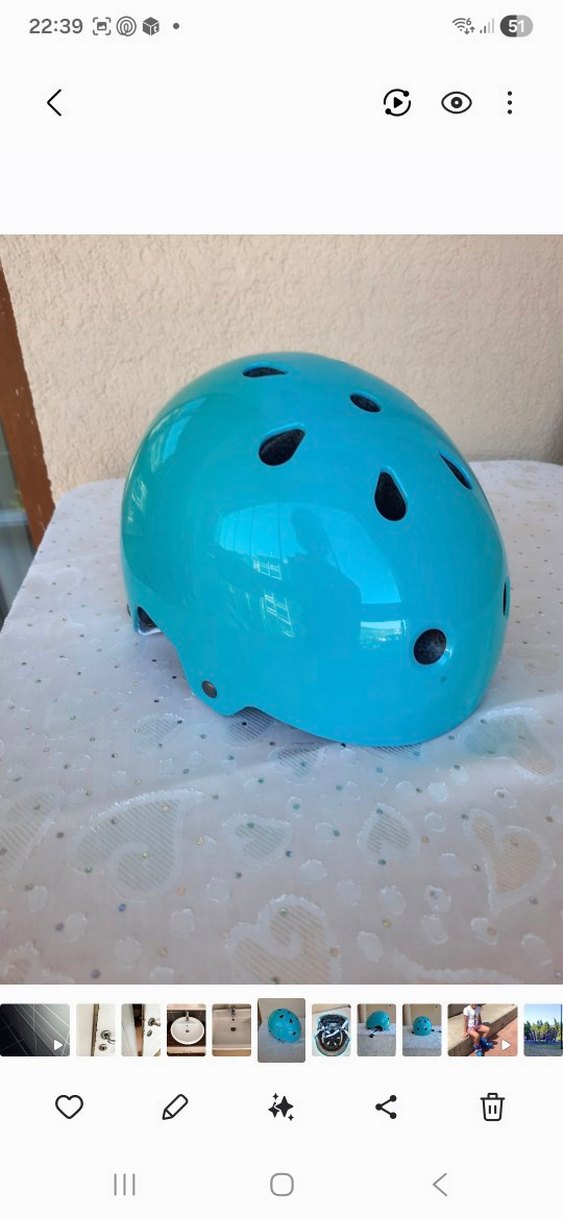 Turkuaz renkte, plastik malzemeden yapılmış, cırt cırtlı kayışlara sahip, delikli ve desensiz biker kask. Sokak stiline uygun. Yaş:10