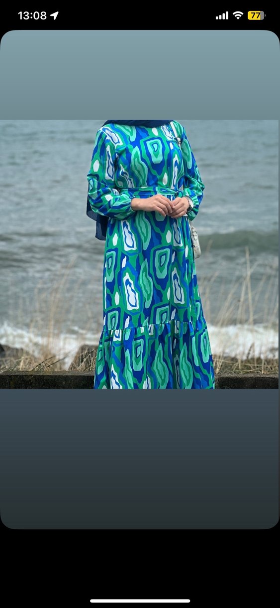 Turkuaz renkli, rengarenk batik desenli, bol kesim ve drapeli uzun elbise. Uzun kollu ve bohem tarzda günlük kullanım için uygun.