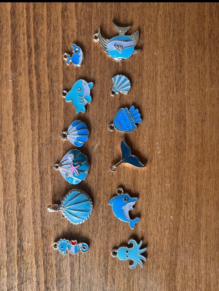 ADET FİYATIDIR…metal , turkuaz renkli deniz temalı kadın charm seti. İşlemeli deniz canlıları ve deniz kabukları, bohem plaj stiline uygun.
