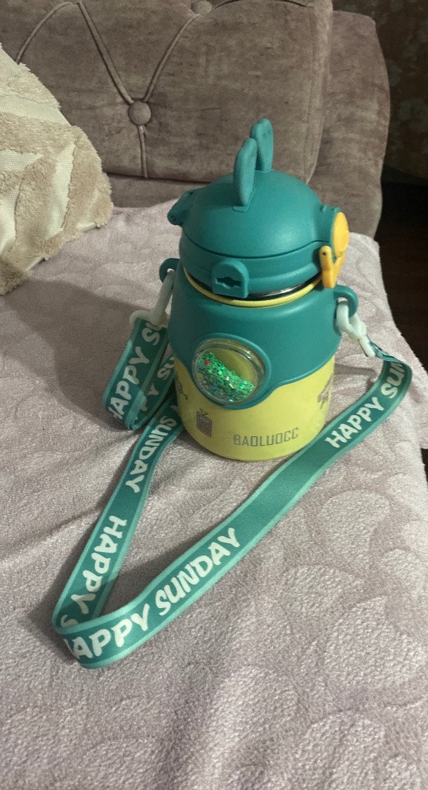 Canlı renklerde, turkuaz çocuk termos matara, üzerinde "HAPPY SUNDAY" yazılı ayarlanabilir askı ile.