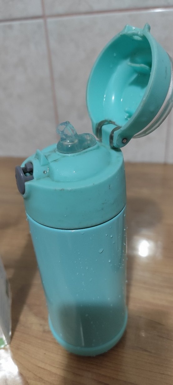 Pastel turkuaz renkli çocuk termos şişesi, açılır kapak ve yumuşak silikon uç ile kolay içim sağlar. İçecekleri sıcak veya soğuk tutar. ağız kısmında yırtık mevcut yana düşünce akıtıyor ama kırık vs değil neden akıtıyor fikrim yok