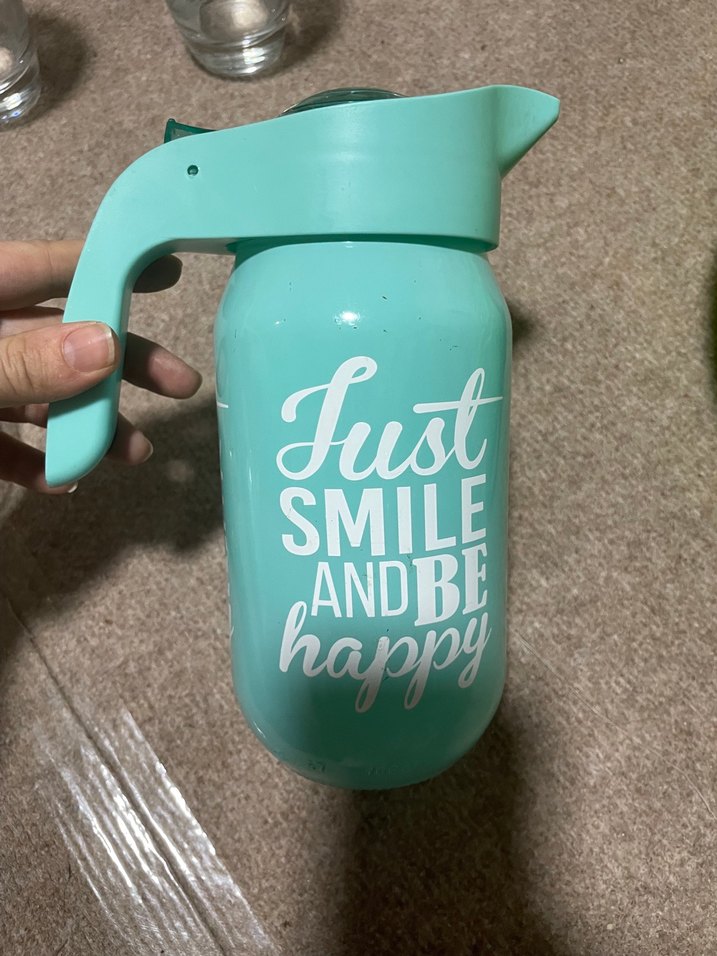 Pastel turkuaz renkte, saplı çocuk termos şişesi. Üzerinde 'Just smile and be happy' yazısı bulunur. İçecekleri sıcak veya soğuk tutar. ☀️