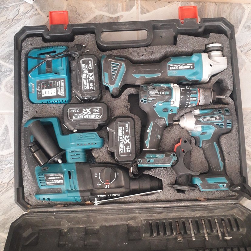 Koyu turkuaz renkli bu akülü matkap seti, piller ve şarj cihazıyla birlikte çeşitli elektrikli aletler içerir, dayanıklı bir kutuda düzenlidir.