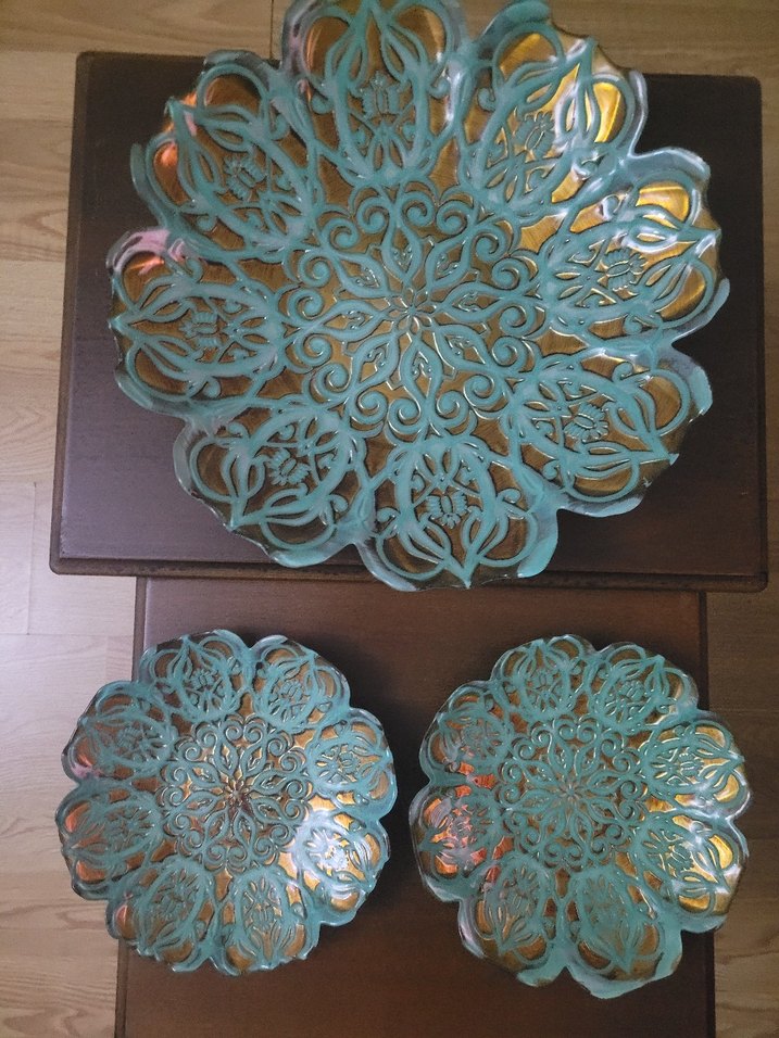 Üçlü set halinde, koyu turkuaz renkte, detaylı kesim desenlere sahip metal dekoratif tabaklar.