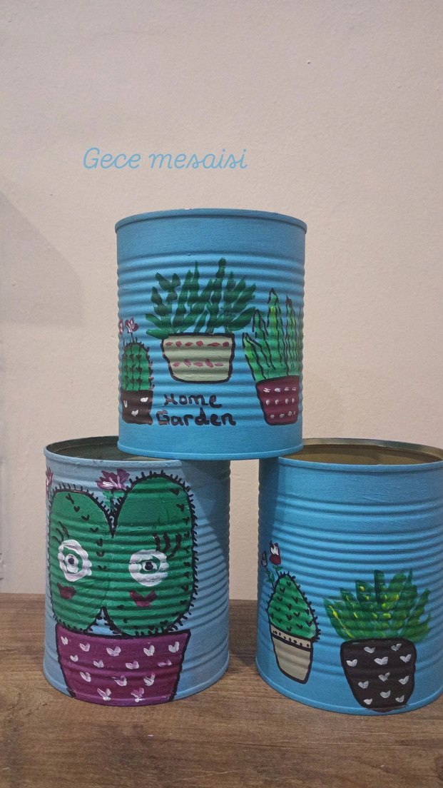 Renkli kaktüs ve bitki desenleriyle boyanmış turkuaz dekoratif konserve kutuları, el yazısı yazılıdır.
