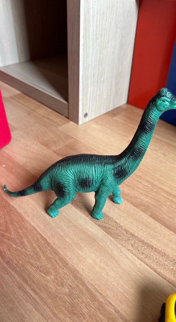Turkuaz renkte, detaylı dokulu yüzeye ve uzun boyun tasarımına sahip renkli dinozor figürü.
