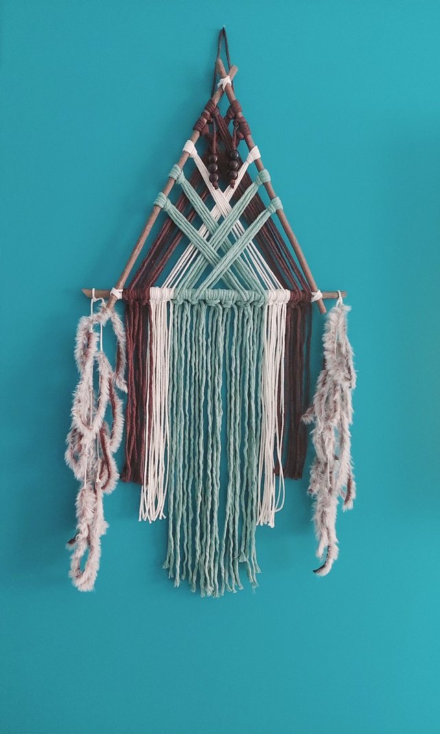 Koyu turkuaz renkli, örme desenler ve sarkan püsküllerle dekoratif duvar süsü, bohem tarzı yansıtır.
