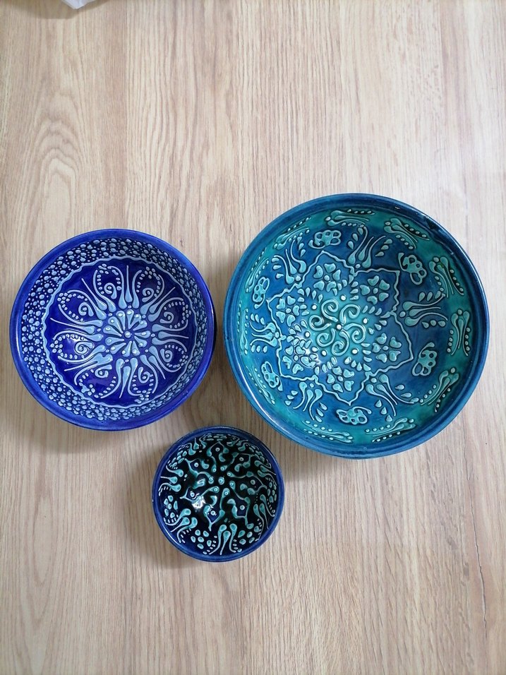 Turkuaz renkte, el işi detaylı desenlere sahip seramik tabak, ev dekorasyonuna renk katmak için ideal.