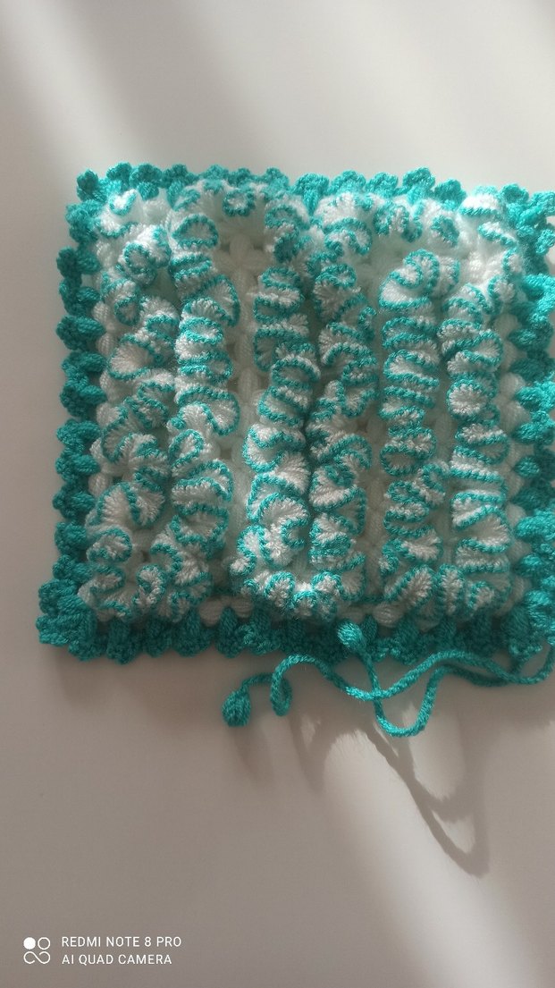 Turkuaz ve beyaz renklerde, el yapımı, kıvrımlı yüzeye sahip banyo lifi Askı ipi bulunmaktadır.