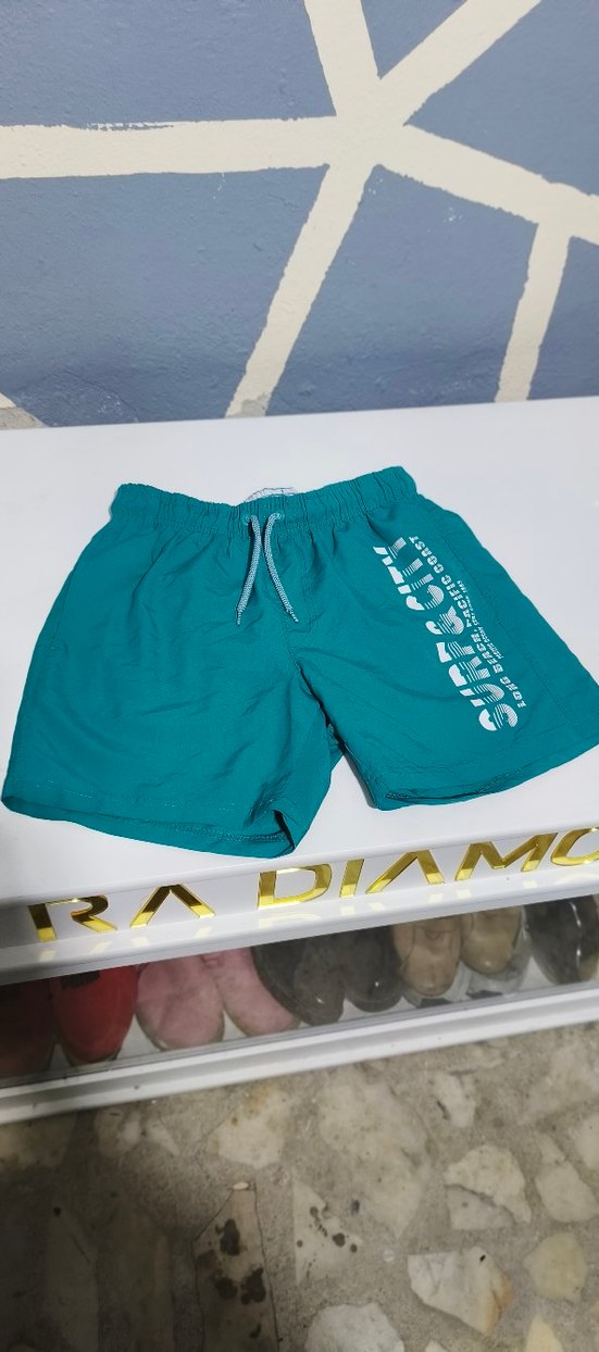 Renkli baskılı, kemerli, bol kesim turkuaz erkek mini şort, plaj ve rahat sokak stili için uygundur.