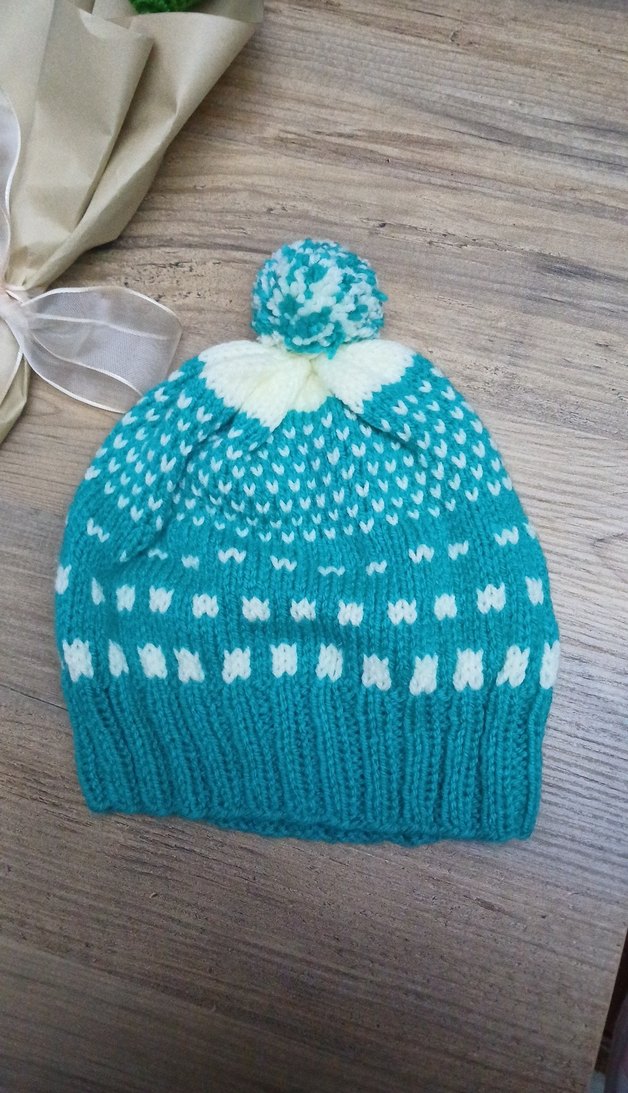 Turkuaz ve beyaz renklerde örgü desenli, üstünde ponpon bulunan rahat ve renkli kadın bere.