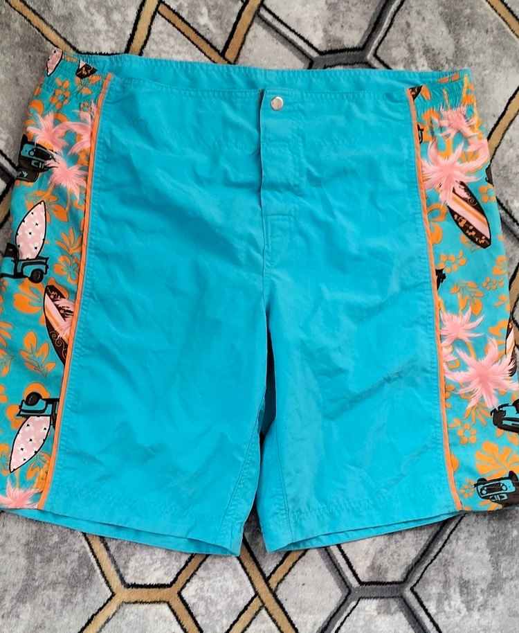 Turkuaz renkli, renkli batik desenli yan panellere ve fermuarlı ceplere sahip, bol kesim midi boy erkek yüzme şortu., açıklama son resimde