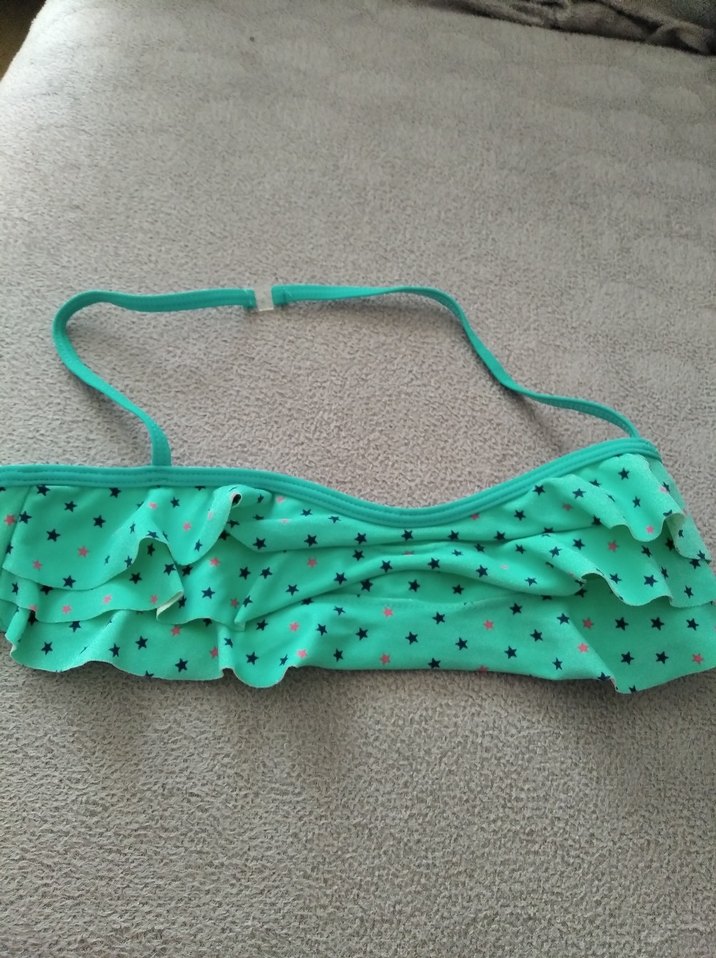 Turkuaz renkli, askılı ve fırfırlı bikini üstü, renkli yıldız desenli. Plajda şık duran, vücuda oturan model. 12 13 yaş