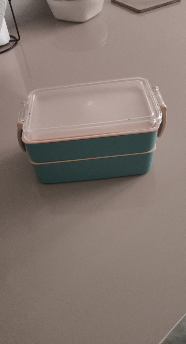 Pastel turkuaz renkte, üst üste konabilen, şeffaf kapaklı ve yan klipsli iki katlı saklama kabı.