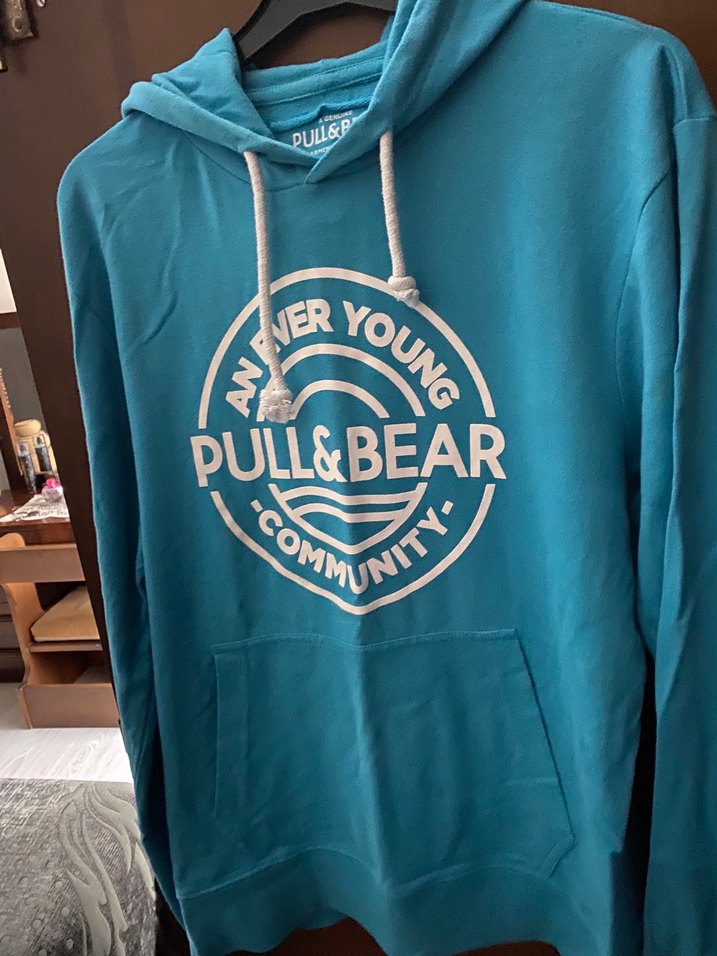 Turkuaz renkli, bol kesim, uzun kollu kadın sweatshirtü. Yumuşak, sıcak kumaştan, düğmeli ve baskılı tasarımlı. Günlük kullanıma uygun, rahat kapüşonlu model. PULL&BEAR baskılı.