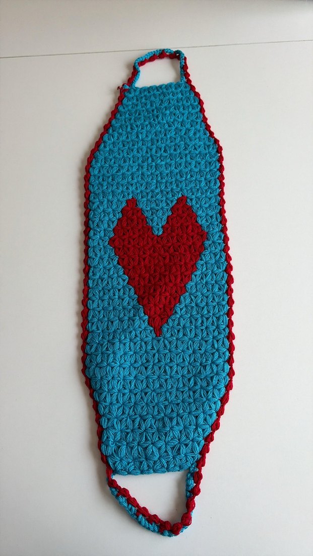 Kırmızı kalp desenli, dokulu yüzeye sahip turkuaz banyo süngeri, kolay kullanım için askılar içerir. banyo lifi. El örmesidir en kaliteli ipliklerle örülmüştür.