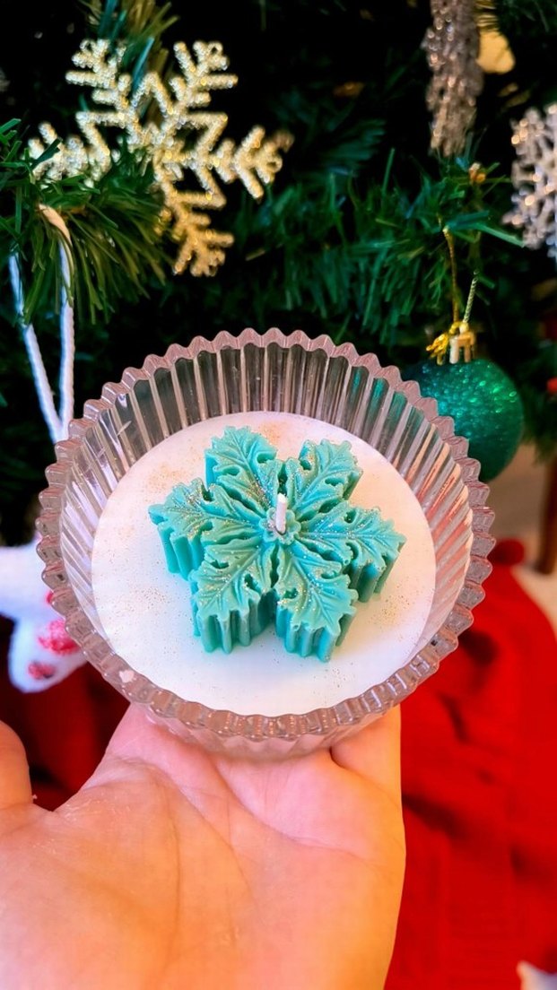 Turkuaz renkli kar tanesi şeklinde mum, şeffaf cam mumluk içinde, dekorunuza renkli bir dokunuş katıyor. ❄️