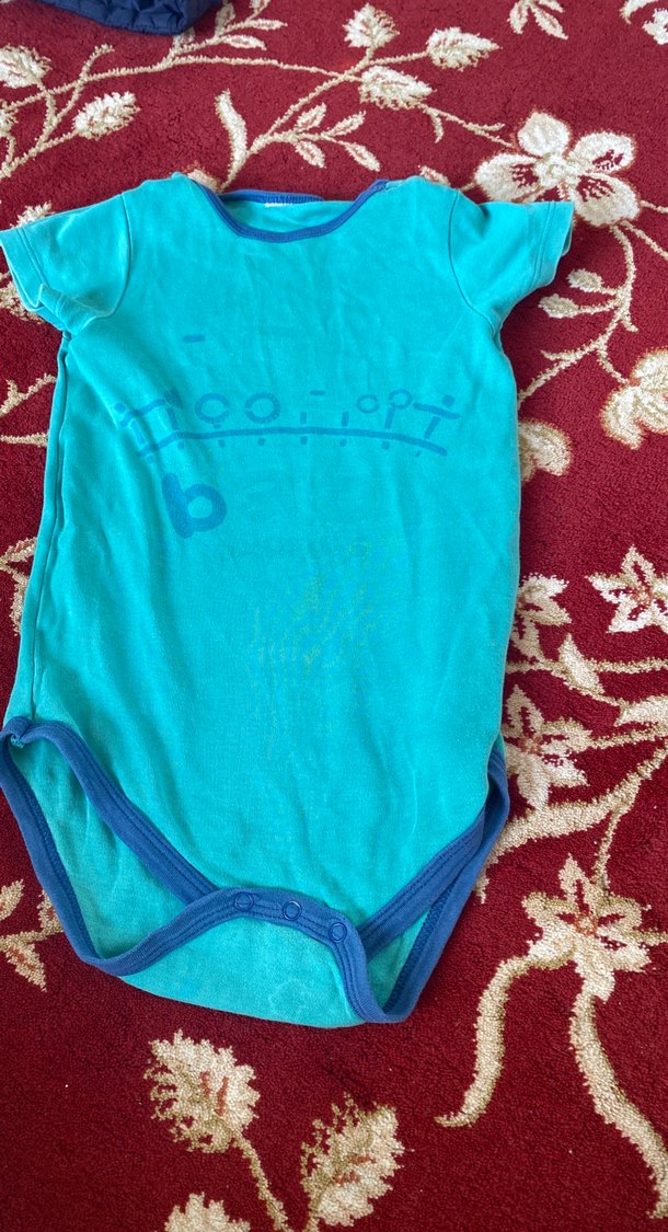 Turkuaz renkli, kısa kollu, yuvarlak yakalı ve renkli baskılı pamuklu bebek body. Çıtçıtlı kapanışı sayesinde kolay giyilir. Sokak stili için uygun.