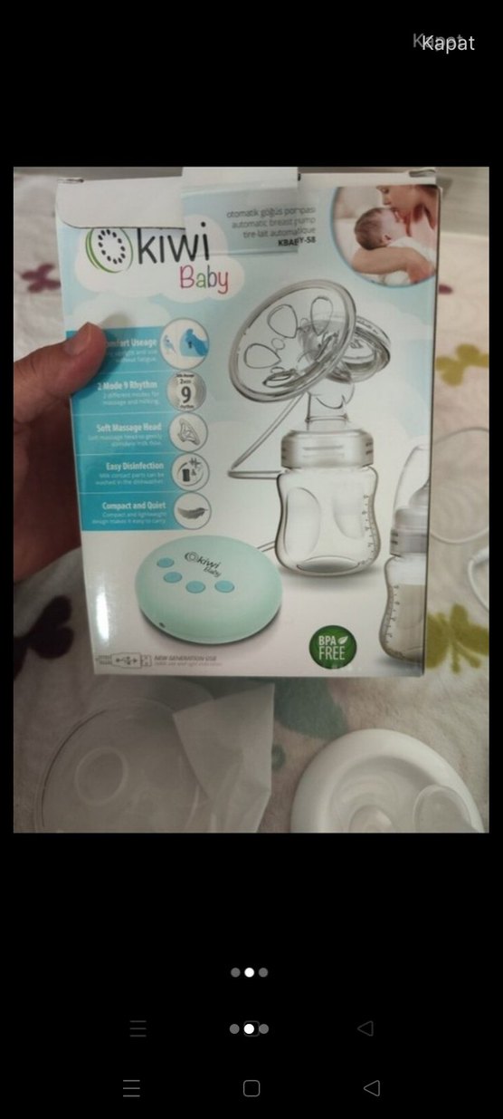 Kiwi Baby göğüs pompası, yumuşak masaj başlığı, 9 emiş seviyesi, kolay dezenfeksiyon ve kompakt sessiz tasarıma sahiptir. BPA içermez, turkuaz renklidir.