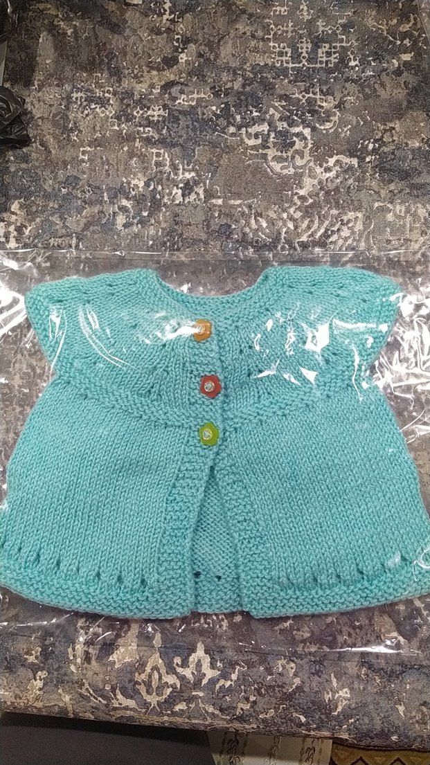 Turkuaz renkli, kolsuz, bohem tarzda, renkli düğmeli, yumuşak triko kumaştan örülmüş kız çocuk yeleği. Bandana ve patik dahil.