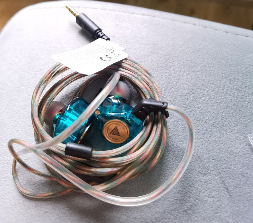 Turkuaz renkli, şeffaf kablolu ve altın detaylı kulak içi kulaklık. Kompakt ve hafif yapısıyla rahat kullanım sağlar.