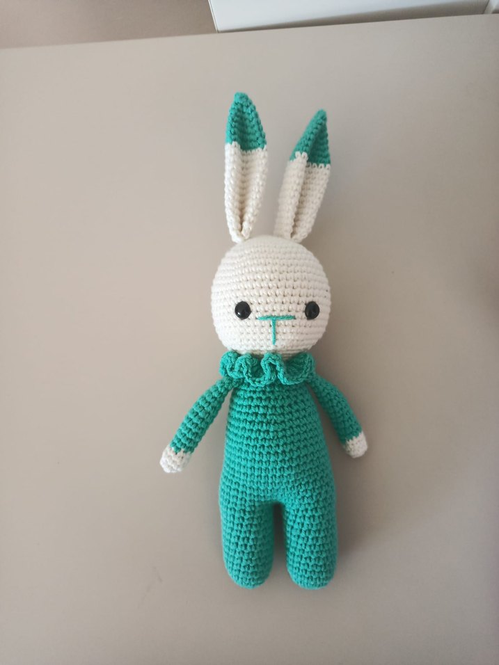 Turkuaz ve beyaz renkte örülmüş, siyah gözlü ve turkuaz burunlu peluş tavşan oyuncak. Fırfırlı yaka ve uzun kulakları var. amigurumi tavşan bebek