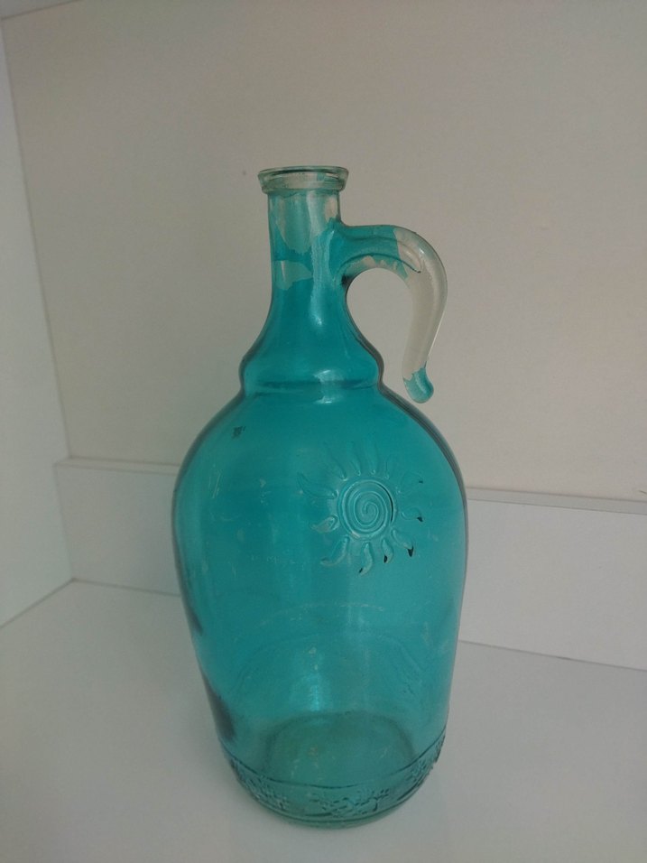 Turkuaz camdan yapılmış, kulplu ve güneş kabartmalı renkli vazo.