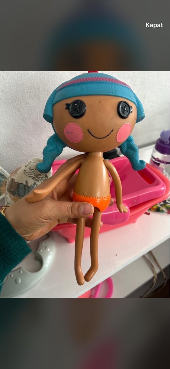 Pastel turkuaz renkte, düğme gözlü ve örgülü saçlı bebek. Turuncu şortlu, yumuşak ve pürüzsüz gövdesi var.