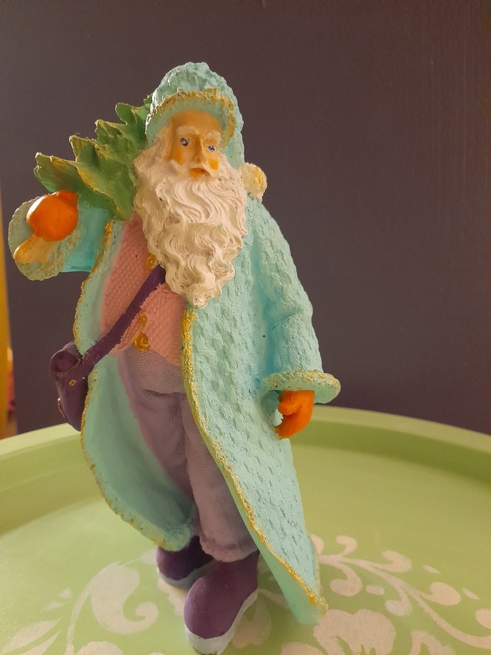 Uzun kaban giymiş, beyaz sakallı yaşlı adam figürini. Turkuaz pastel renkte, dokulu yüzeye sahip, küçük bir çanta taşıyor.