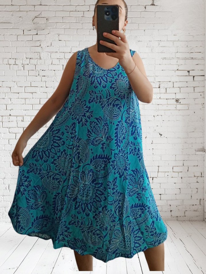Turkuaz renkli, çiçek desenli ve salaş kesimli, drapeli uzun elbise. Yumuşak sentetik kumaştan, kolsuz ve bohem tarzda.Beden.36.46 bedene kadar uygundur..