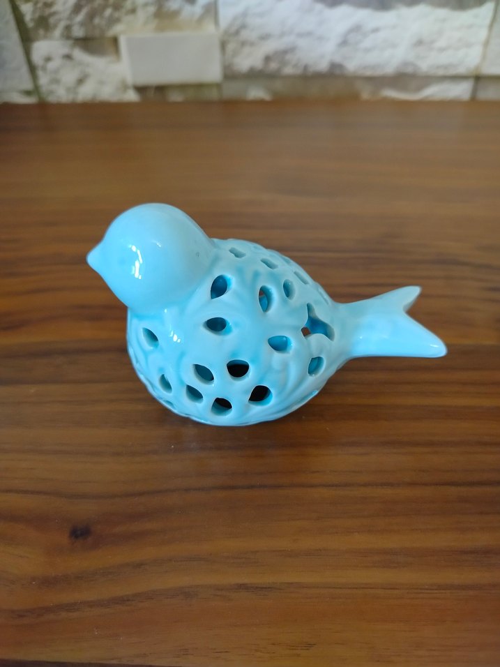 Turkuaz renkte, delikli dekoratif tasarıma sahip seramik kuş biblo. Canlı rengiyle mekanlara şıklık katıyor.