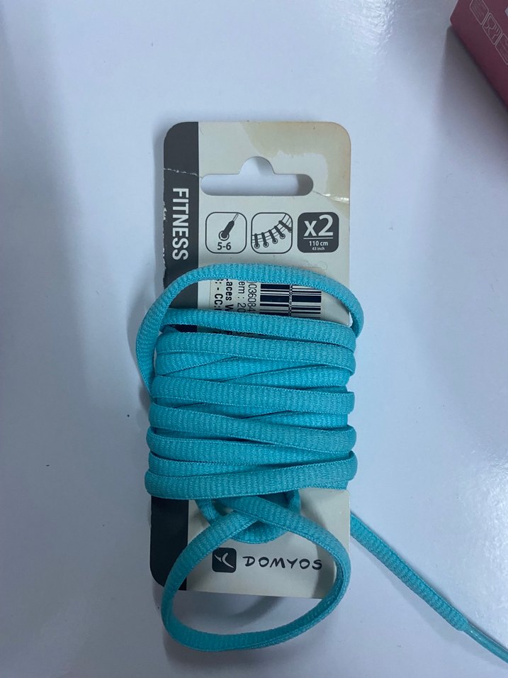 Decathlon markasına ait turkuaz renkli, 5-6 delikli spor ayakkabılar için uygun 110 cm uzunluğunda 2 adet bağcık.