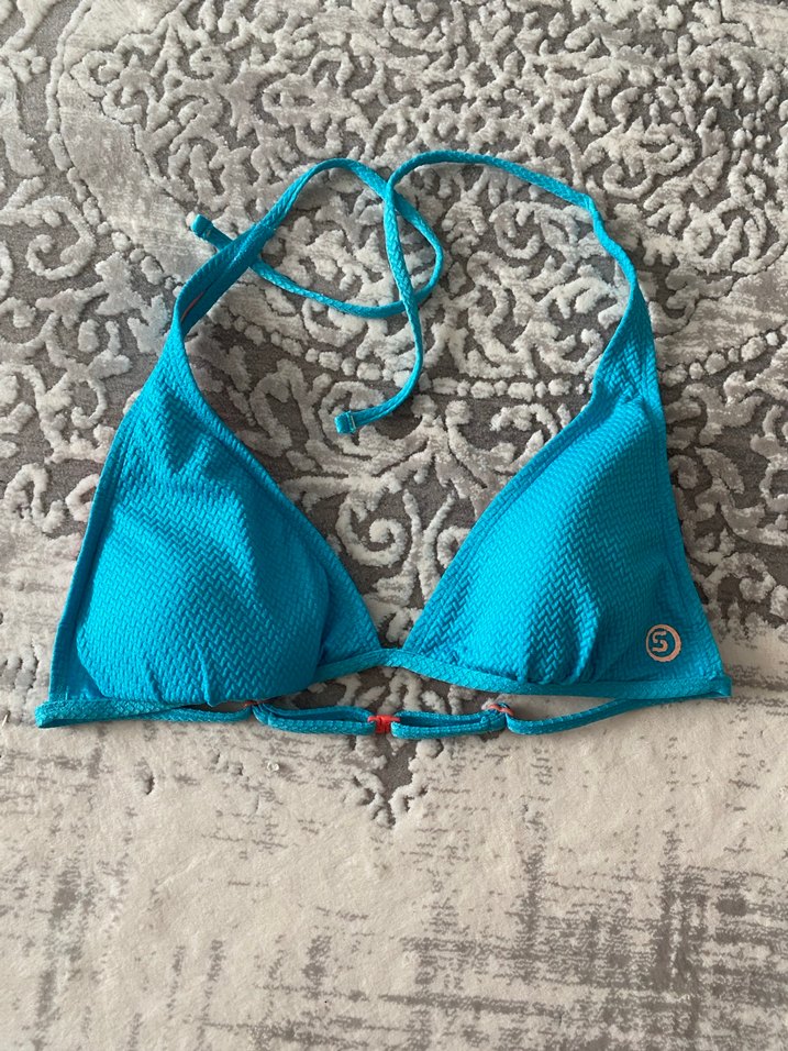 Turkuaz renkli, sıkı oturan bikini üstü, askılı ve fermuarlı detaylı, renkli yılan deseni ile plaj için uygun ️.m L beden.