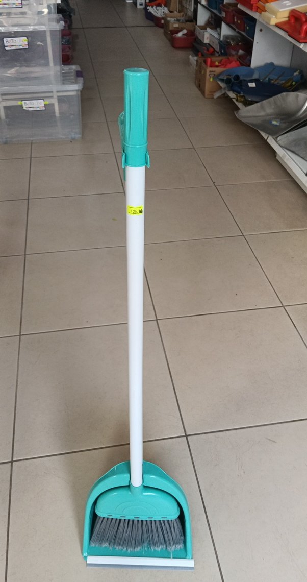 Pastel turkuaz renkte, uzun saplı süpürge. Zeminleri etkili şekilde temizlemek için uygundur.