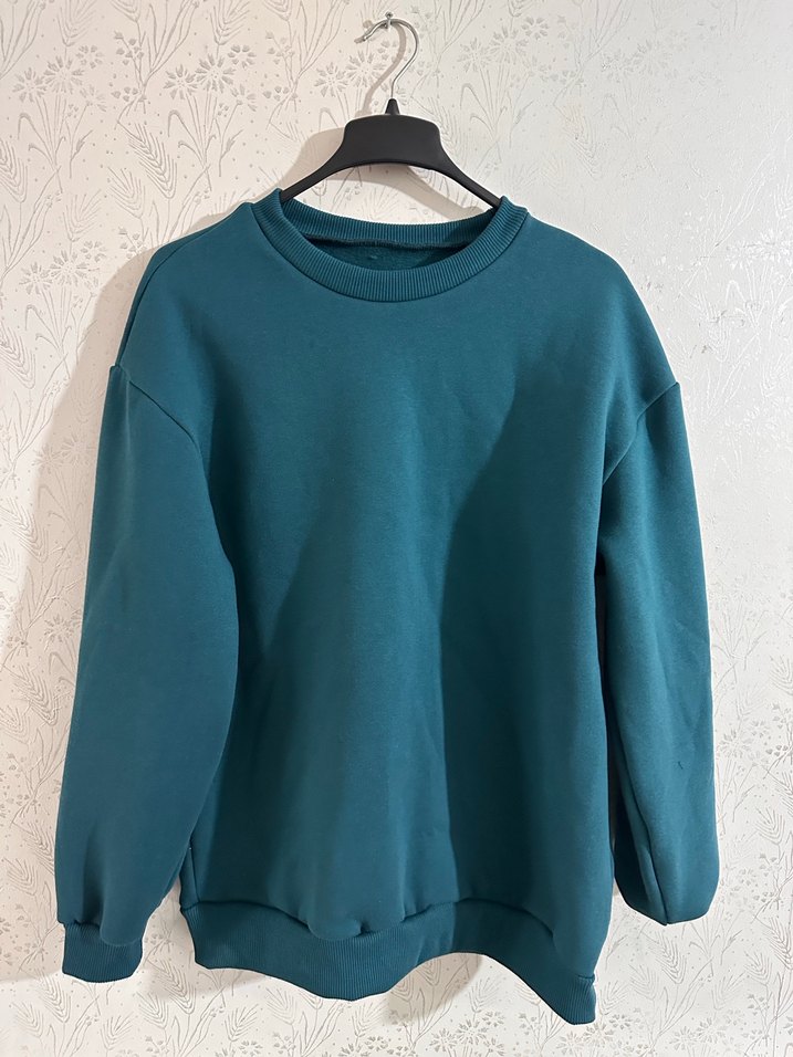Turkuaz renkli sweatshirt, yuvarlak yaka ve uzun kolludur. Yumuşak ve sıcak kumaştan üretilmiş, rahat ve bol kesimdir. Günlük kullanıma uygun sade ve şık bir parça.
