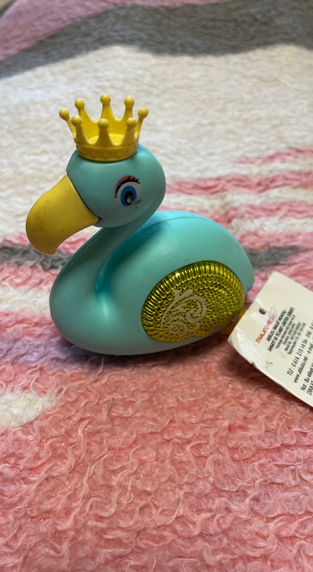 Turkuaz renkte, sarı taçlı ve renkli detaylara sahip kuğu şeklinde çek bırak oyuncak