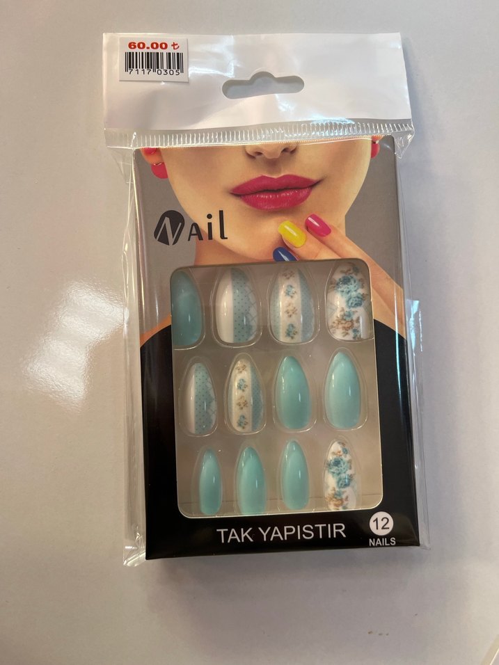 Çiçek desenli açık turkuaz renkte, tak yapıştır 12 adet tırnak süsü seti.