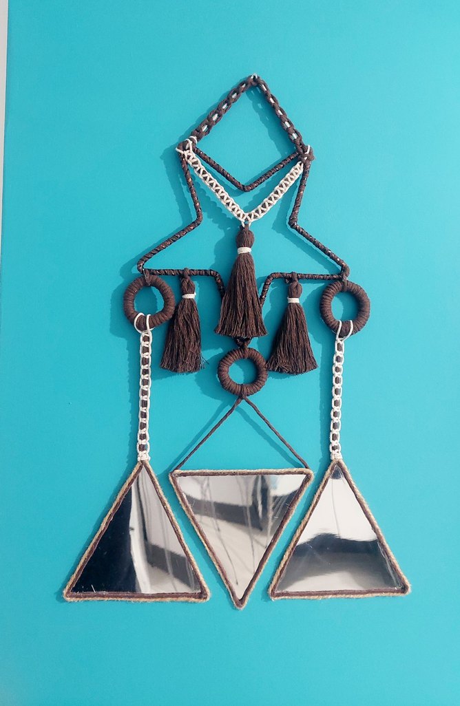 Üçgen aynalar ve koyu püsküllerle süslenmiş turkuaz renkli duvar dekoru. Her odaya dekoratif bir dokunuş sağlar.