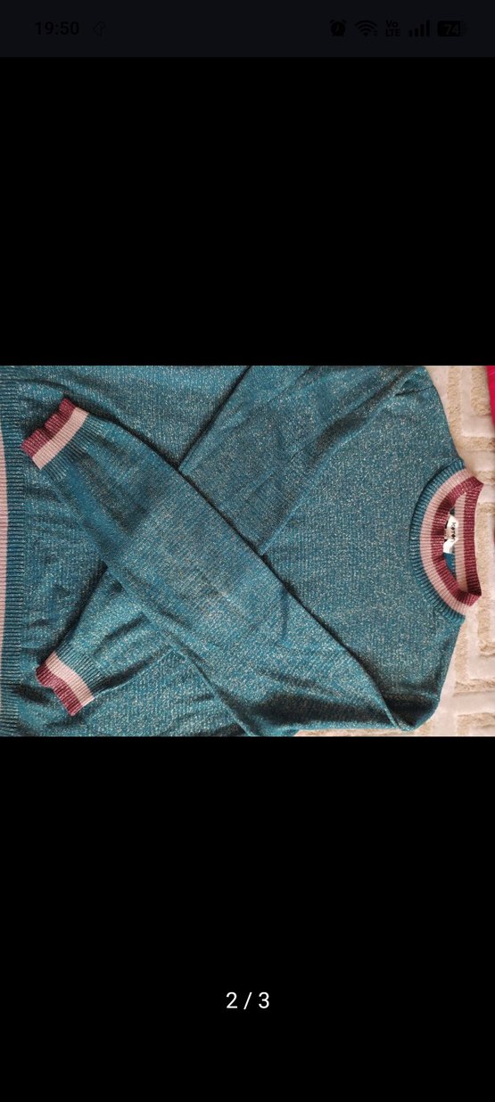 Turkuaz renkli, uzun kollu, yuvarlak yaka, parlak batik desenli triko kazak. Rahat kesimli ve midi boyda, günlük sokak tarzına uygun.